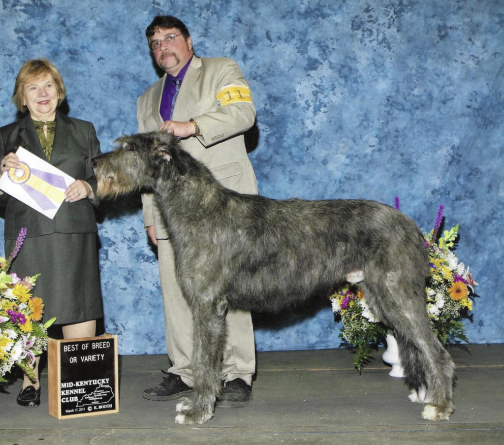 My wife, Gael Lewis-Damron, raised, trained and showed Irish Wolfhounds from 1969. We met (although I knew her parents well and who she was) officially in 1992, and in a matter of 4 months we were married. I had gone to shows with her and her family prior to our marriage and actually proposed to her at a dog show.